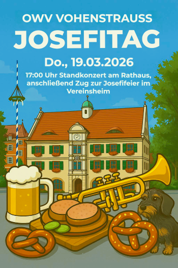 Donnerstag, 19.03.2026: Josefifeier; Treffpunkt um 17:00 Uhr am Rathaus zum Standkonzert. Anschließend Zug zur Alten Apotheke und gemütliches Beisammensein bei Brotzeit und Zoigl.
